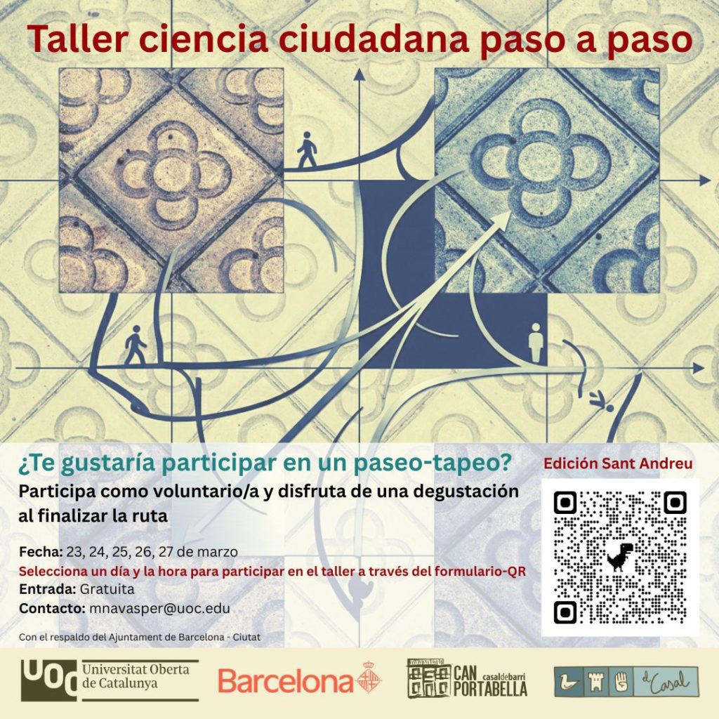 El taller Ciència ciutadana pas a pas (II edició) forma part d’un estudi centrat en la mobilitat per a vianants en zones pacificades de Barcelona. Aquest projecte està impulsat pels grups de recerca CoSIN3 i TURBA de la Universitat Oberta de Catalunya (UOC) i amb el suport de l’Ajuntament de Barcelona.