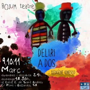 Aquest cap de setmana us oferim “Deliri a dos” d’Eugène Ionesco, sota la direcció de Montse Bonet. Una metàfora sobre l’absurditat del món en què vivim.